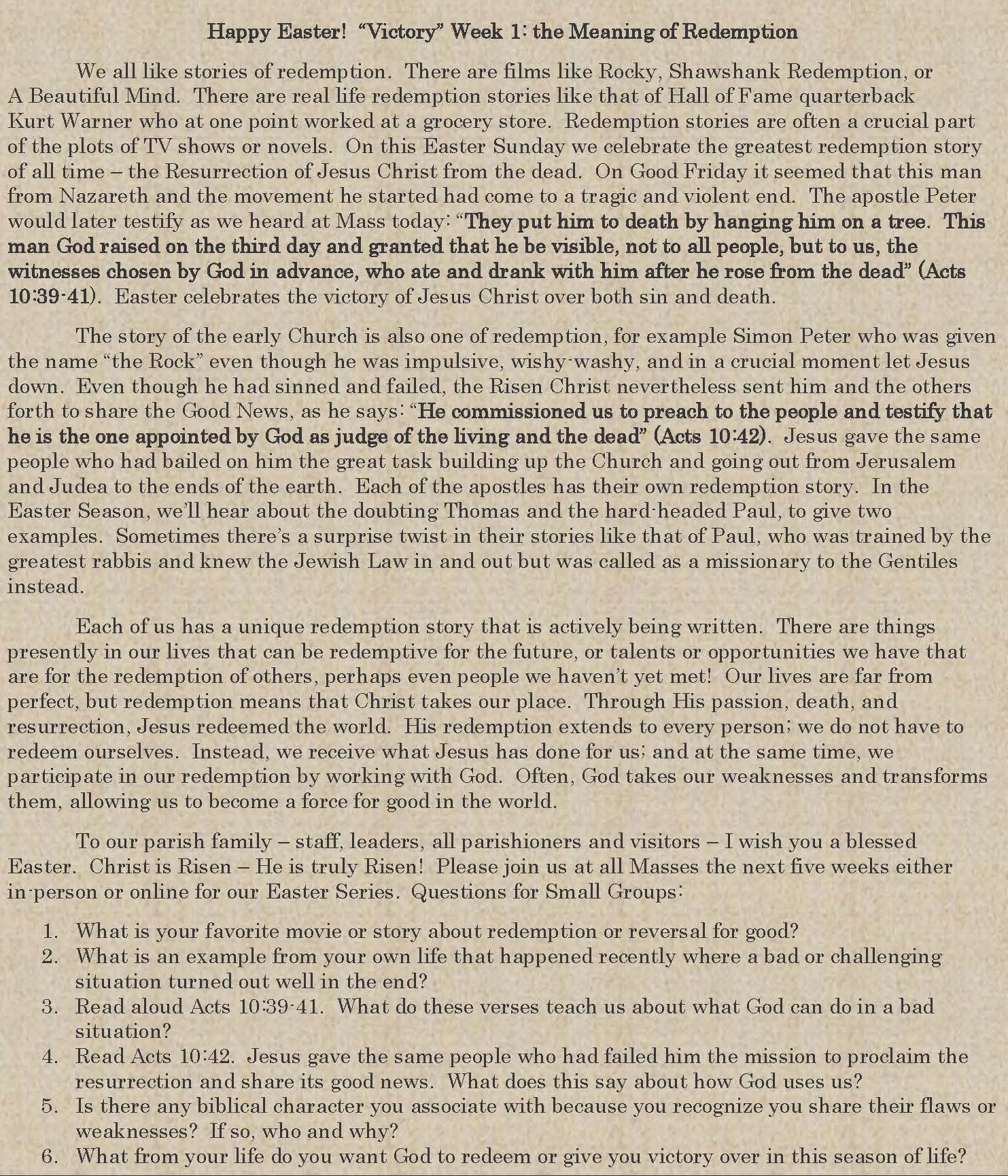 I offer much encouragement and gratitude for the parents of our children, to Marybel our Director of Faith Formation as well as Connie DiGregorio and Erica Johnson our level 2 facilitators; and a special thank you to Alex Kolakowski, a graduating senior this year, who has served here several years as the “priest” when the children are practicing for First Penance and receiving Communion. May the God of encouragement remain with you always! Questions for Small Groups: